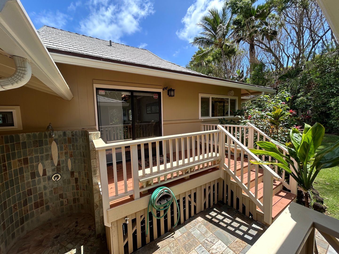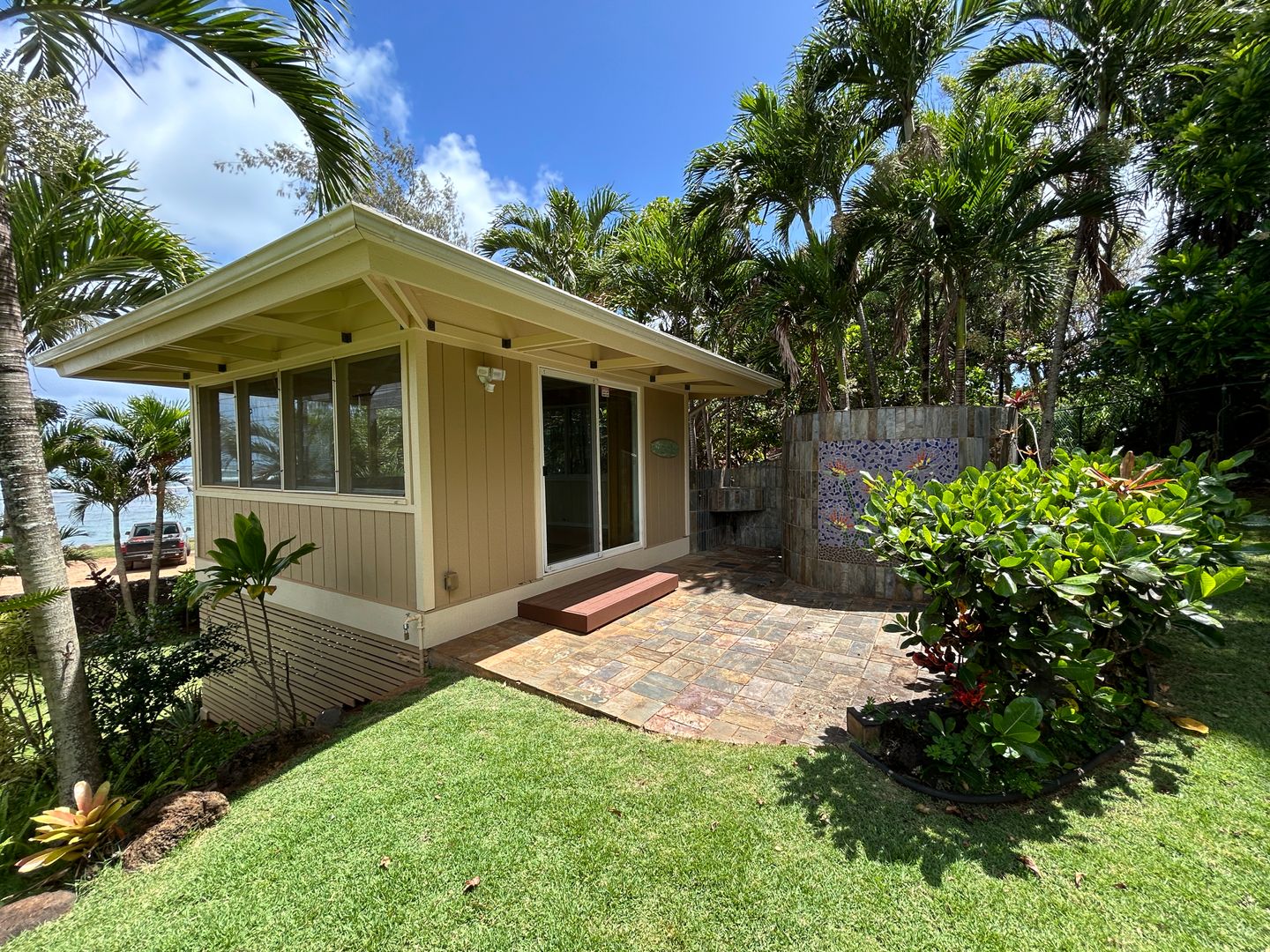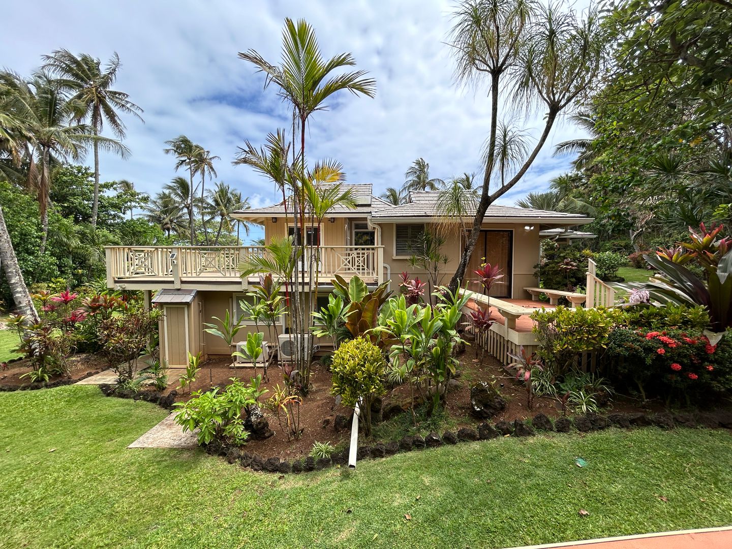 Private, secluded home with lava rock wall and gate on nearly 3/4 acres. The home sits across from Anahola Beach with gorgeous ocean views from the home. There are 3 bedrooms and 3 full bathrooms. The home has AC units in bedrooms, office and living area. There is an additional space for yoga studio/flex space. Includes 2 outdoor showers. This is a long term rental requiring a minimum 6 month rental agreement.