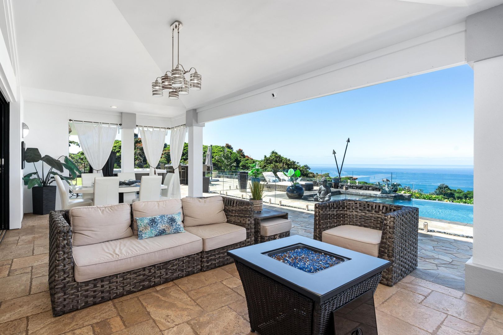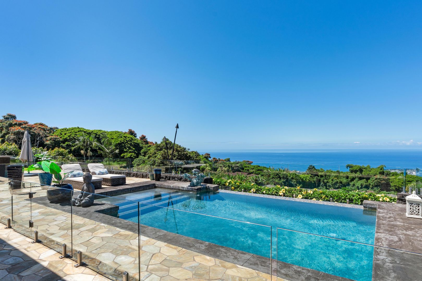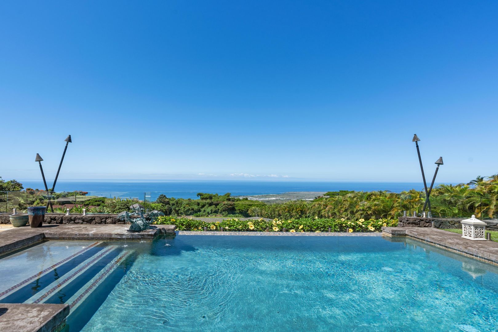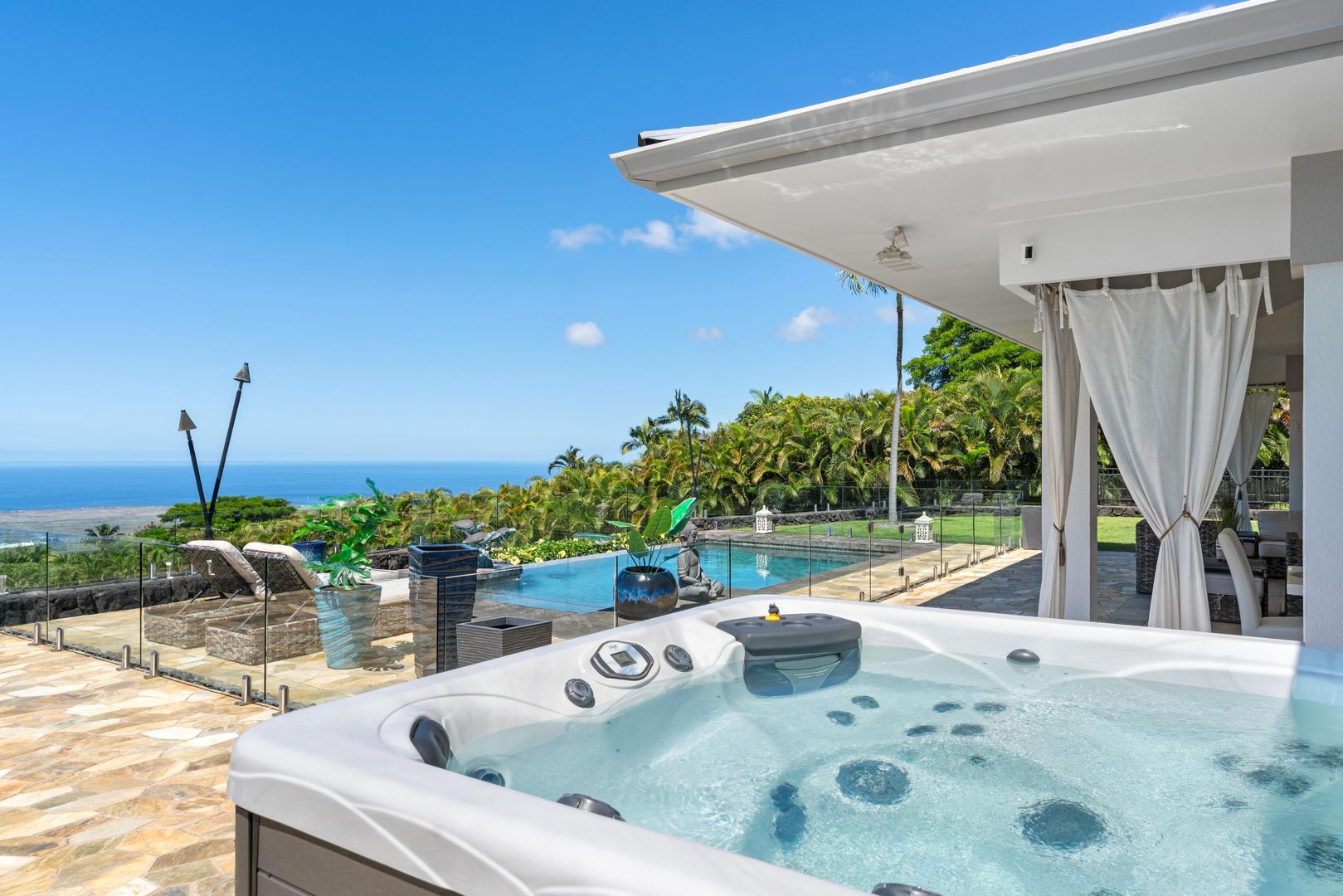 The home includes a gourmet kitchen with Hestan appliances and quartz countertops. There is an expansive lanai with outdoor furniture perfect for entertaining with a heated salt water pool and hot tub, all with gorgeous ocean views! There is a Koi Pond in the front of the home.