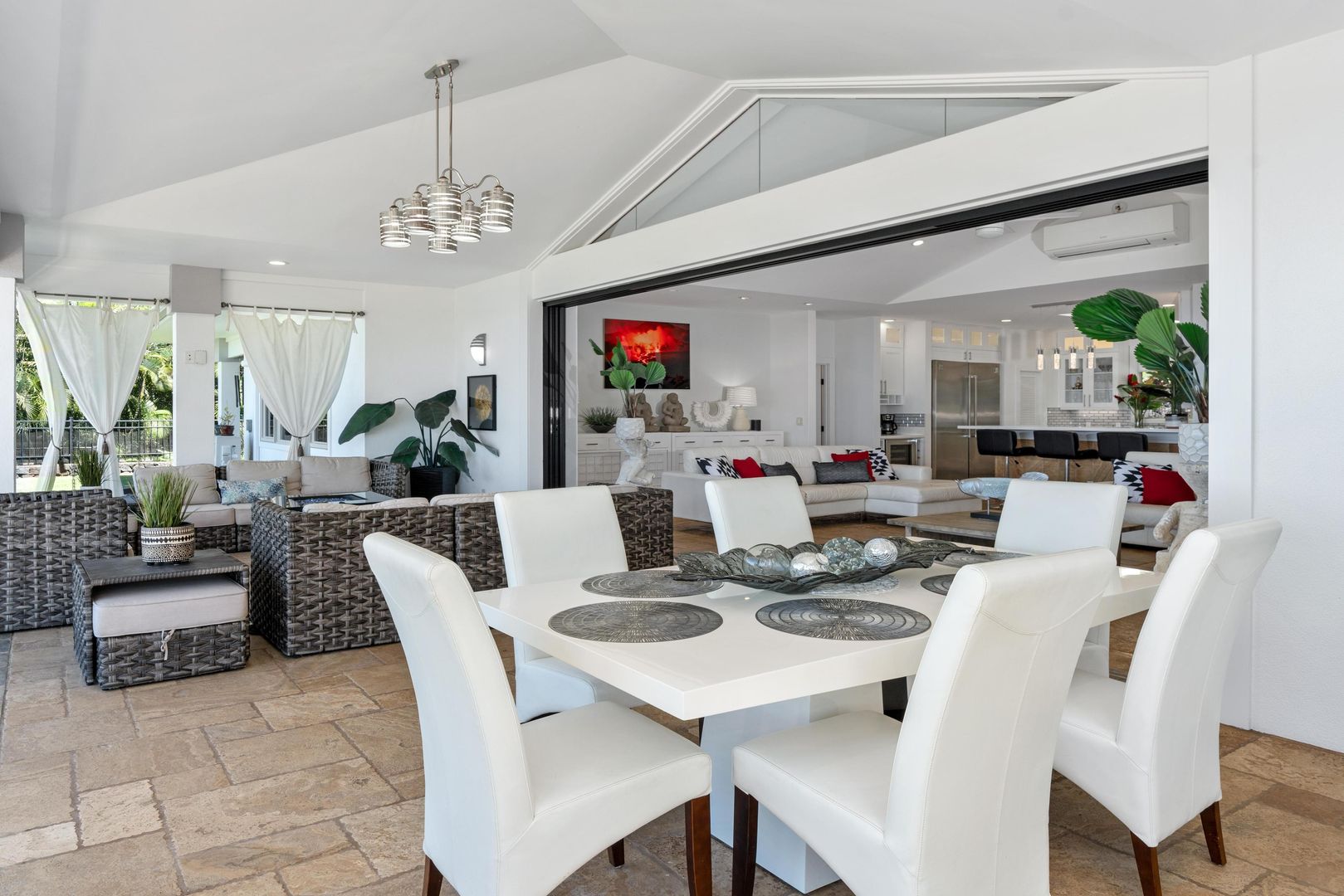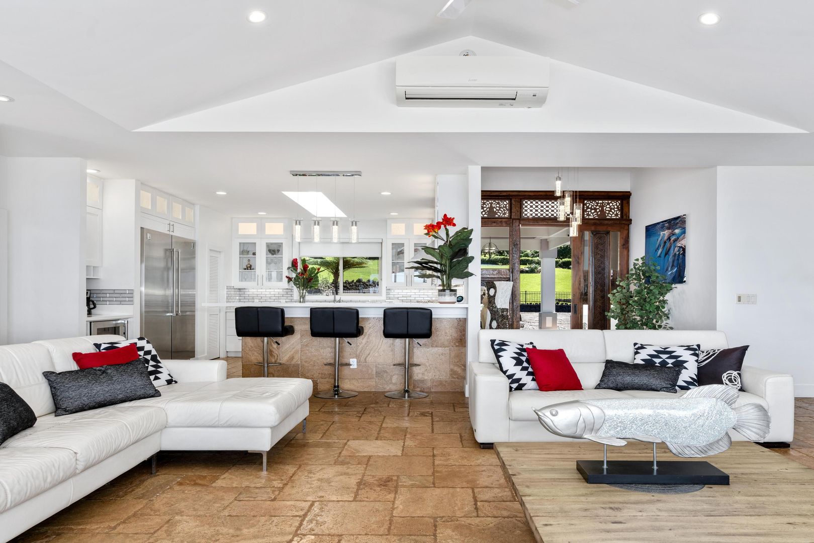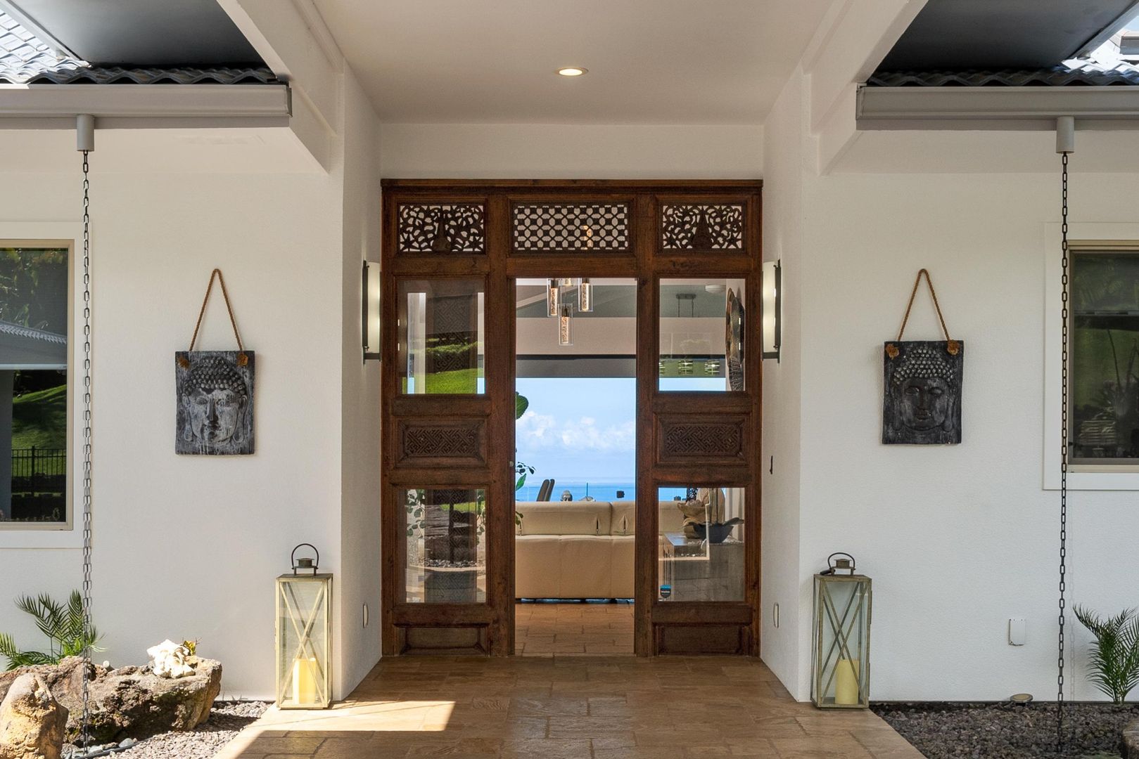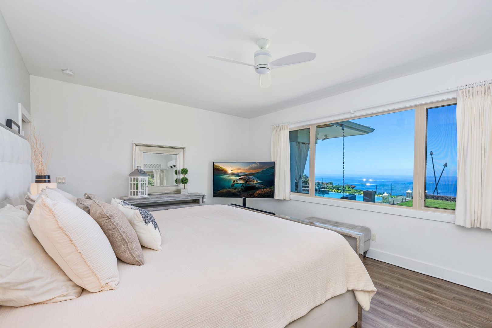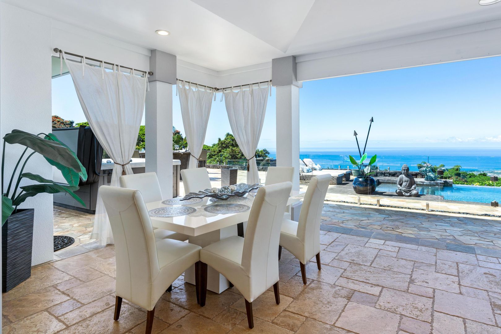 The home includes a gourmet kitchen with Hestan appliances and quartz countertops. There is an expansive lanai with outdoor furniture perfect for entertaining with a heated salt water pool and hot tub, all with gorgeous ocean views! There is a Koi Pond in the front of the home.