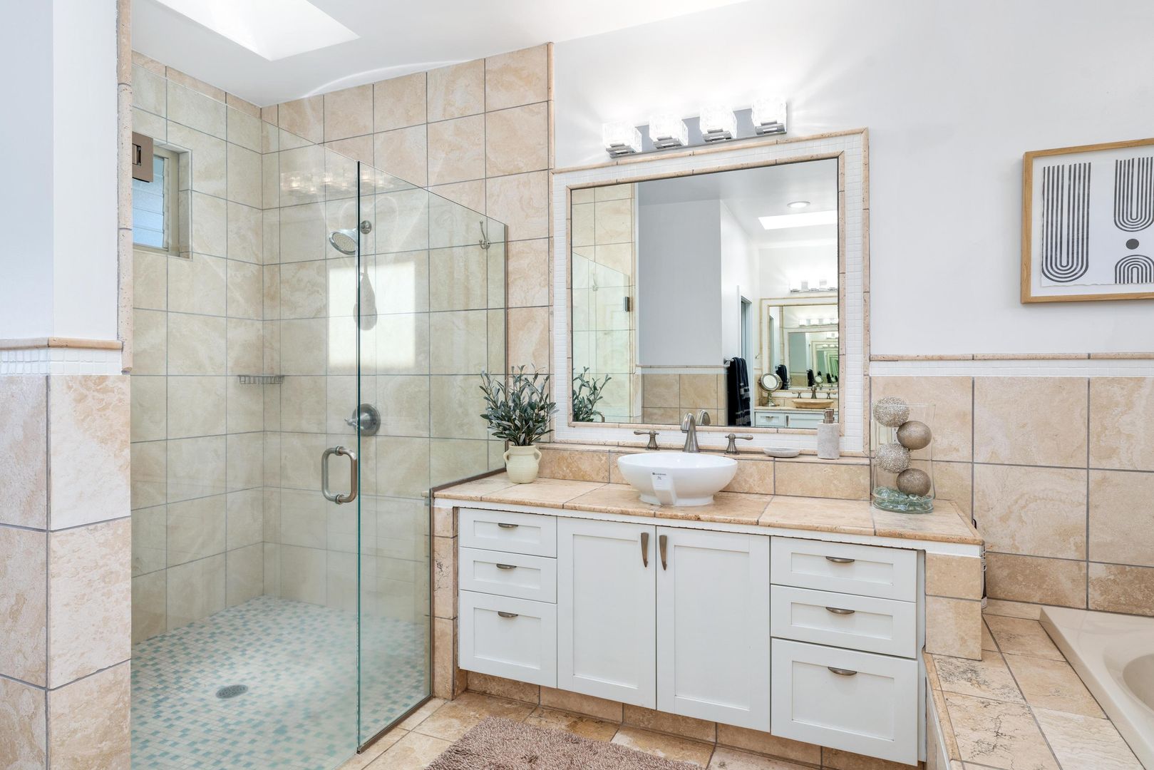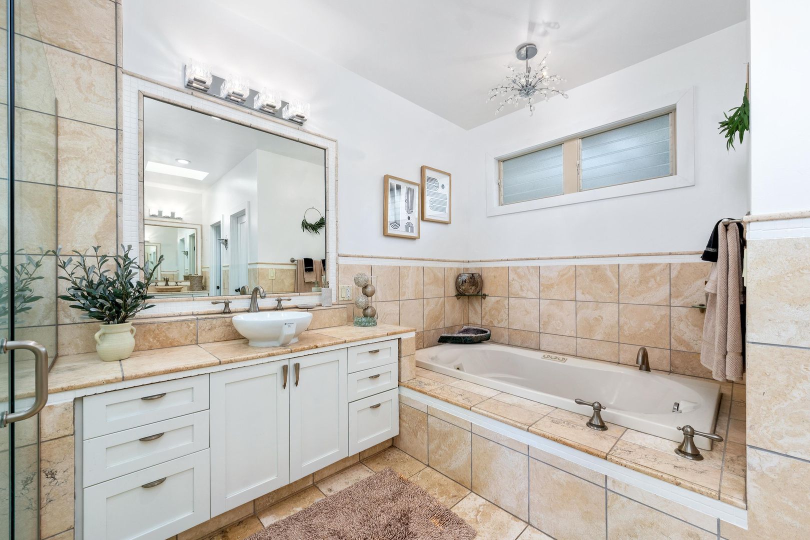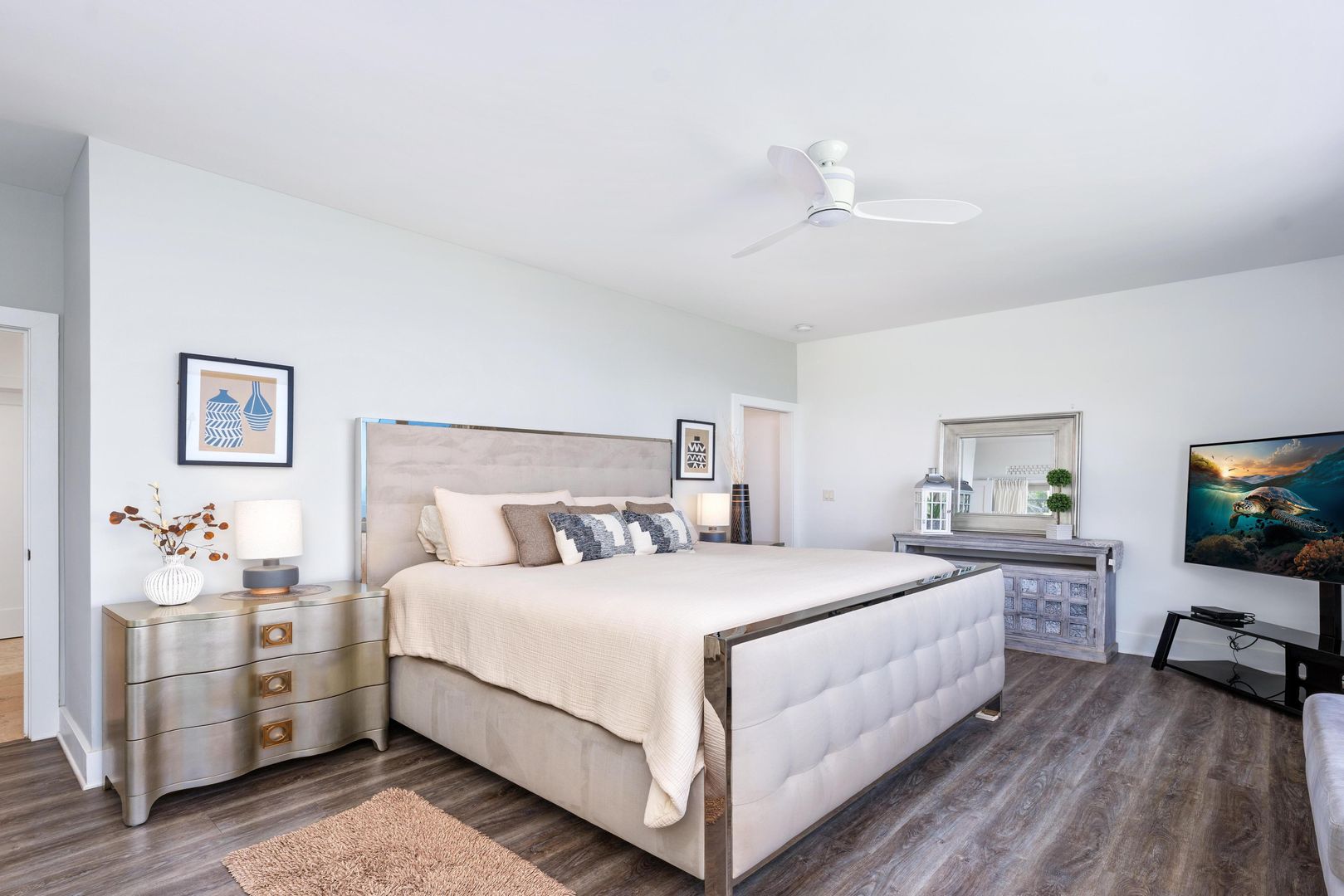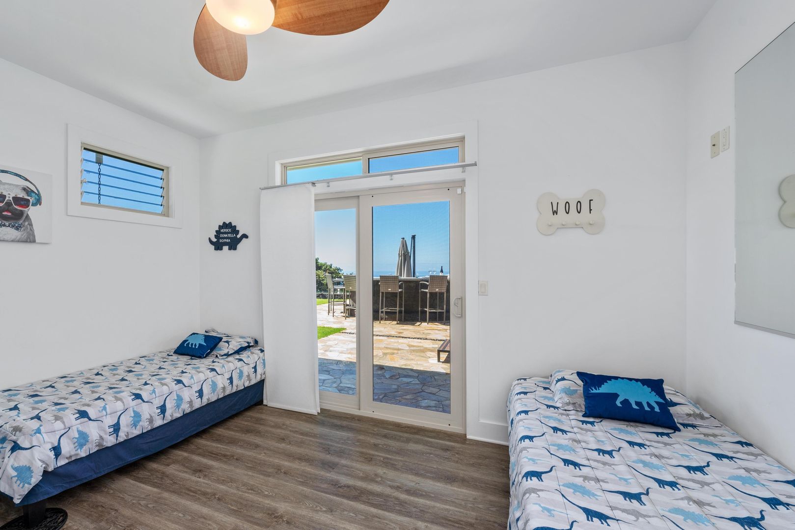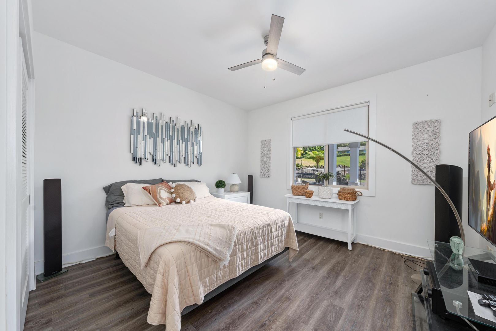 There is new flooring in the bedrooms with new updated light fixtures, fans and blinds throughout. There are new AC split units and a soft water system.