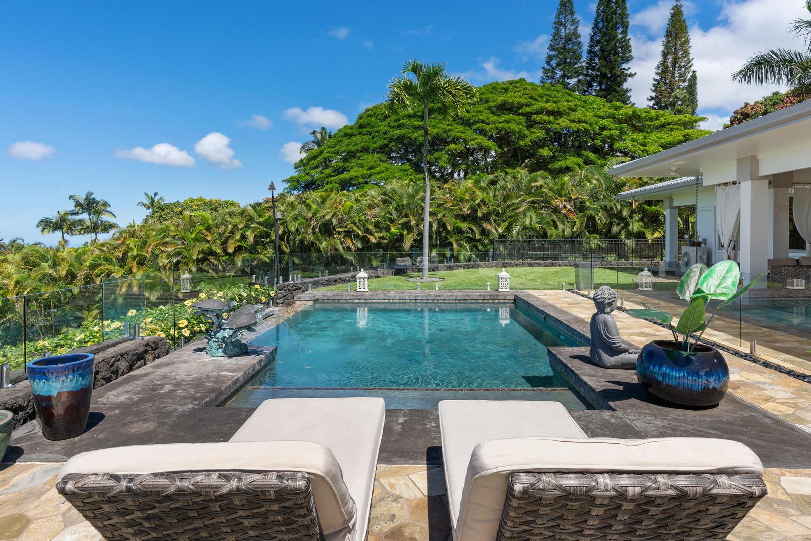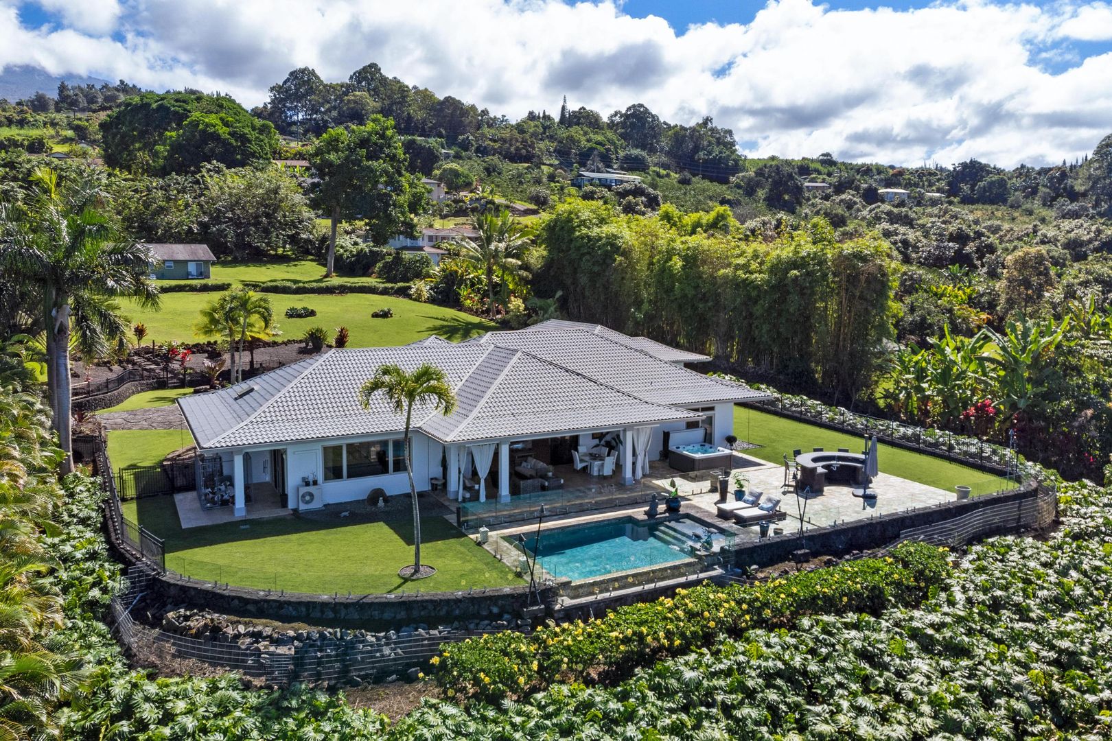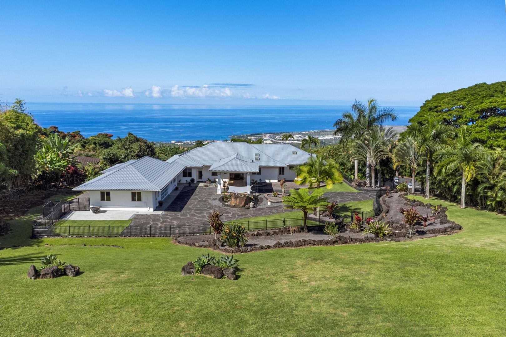 Private executive gated estate on 3 acres in Holualoa with lava rock driveway. The home has 4 bedrooms and 3 bathrooms and and a 1 bedroom 1 bath studio .